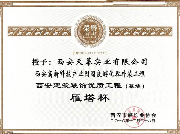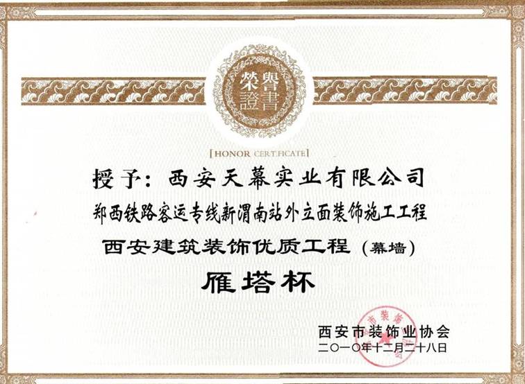 會(huì)上,副會(huì)長(zhǎng)黃柱子通報(bào)獲得“西安建筑裝飾優(yōu)質(zhì)工程(雁塔杯)”企業(yè)并授牌;其中由我公司承建的的“鄭西鐵路客運(yùn)專線新渭南站外立面裝飾施工工程”和“西安高新科技產(chǎn)業(yè)園閻良孵化器外裝工程”同時(shí)獲得“西安建筑裝飾優(yōu)質(zhì)工程(雁塔杯)”獎(jiǎng)。此次獲獎(jiǎng)是對(duì)公司在過(guò)去一年中所做成績(jī)的肯定,公司全體管理人員秉承企業(yè)精神,項(xiàng)目部精心組織,精心施工,取得了經(jīng)濟(jì)效益的同時(shí)也為公司爭(zhēng)得了榮譽(yù)。也是對(duì)“出自天幕,必為精品”的經(jīng)營(yíng)理念的最好詮釋。