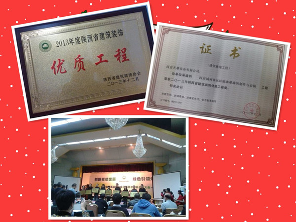 俗話說,有付出就有回報,也正因為如此,我公司勞有所獲。2013年末,我公司收到陜西省建筑裝飾協(xié)會寄來的通知函,參加2014年1月8日陜西省建筑裝飾協(xié)會第三屆四次會員代表會議。本次會議除了是一次關于建筑裝飾行業(yè)2013年度的工作總結報告會,還是一次2013年度總結表彰榮譽大會。在本次表彰大會上,我公司被題名榮獲由陜西省建筑裝飾協(xié)會頒發(fā)的資質榮譽證書——西安天幕實業(yè)有限公司在承建的《西安城南客運站玻璃幕墻的制作與安裝》項目工程榮獲2013年度陜西省建筑裝飾優(yōu)質工程獎。