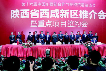 在西洽會(huì)上,《西咸新區(qū)重點(diǎn)項(xiàng)目推介暨重點(diǎn)項(xiàng)目簽約會(huì)》專題推介西咸新區(qū)發(fā)展建設(shè)及重點(diǎn)招商引資項(xiàng)目情況,并舉行專場簽約活動(dòng)。西咸新區(qū)五個(gè)新城分別與中國交通建設(shè)股份有限公司、第四軍醫(yī)大學(xué)、綠地集團(tuán)、幸福航空公司、馬來西亞商會(huì)、深圳市特爾佳科技股份公司等企業(yè)簽訂了項(xiàng)目開發(fā)建設(shè)合同,所簽訂的合同項(xiàng)目10個(gè),合同投資額785.43億元,協(xié)議項(xiàng)目2個(gè),投資總額200億元;涉及園區(qū)綜合開發(fā)、信息產(chǎn)業(yè)、生物醫(yī)藥、現(xiàn)代農(nóng)業(yè)、裝備制造、臨空產(chǎn)業(yè)、商貿(mào)物流、環(huán)保產(chǎn)業(yè)等8大類。