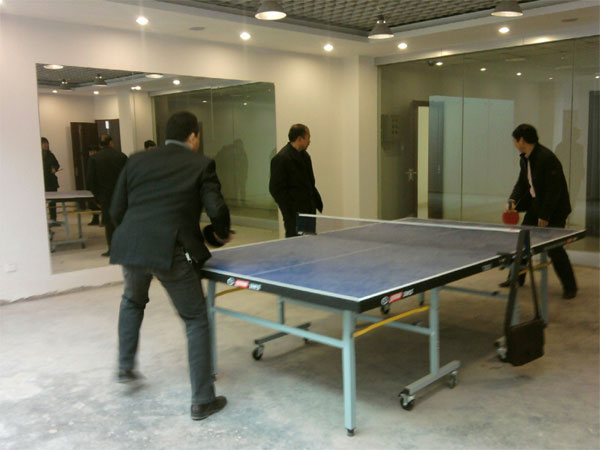 看,就在今天午休時間,在公司地下一層健身房內(nèi),便上演了一場激烈的乒乓球比賽。比賽選手分別是工程部朱總和市場部吳經(jīng)理,這兩人可算是旗鼓相當(dāng),各具所長,為了不錯過這場精彩的比賽,我自告奮勇客串起了裁判,樊叔監(jiān)戰(zhàn),其余人觀戰(zhàn)。