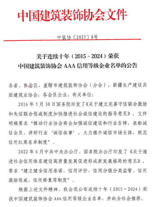“AAA”信用等級是中國建筑裝飾行業(yè)企業(yè)信用評價的最高級別,代表企業(yè)在履約能力、工程質(zhì)量、市場信譽(yù)、社會責(zé)任等方面均達(dá)到行業(yè)頂尖水平。