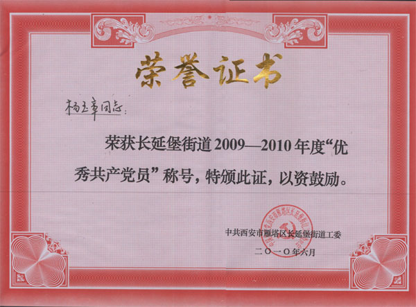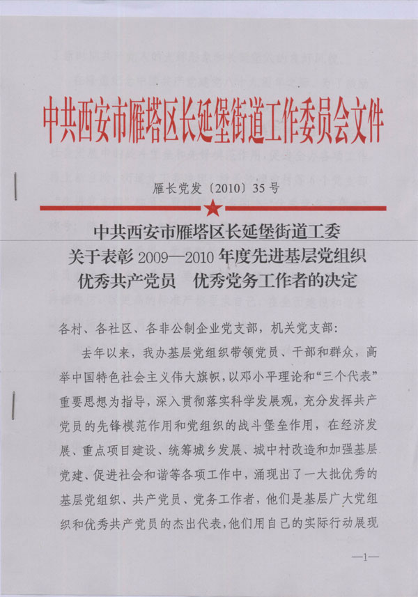 今天中共西安市雁塔區(qū)長(zhǎng)延堡街道工委發(fā)布了“關(guān)于表彰2009—2010年度先進(jìn)基層黨組織優(yōu)秀共產(chǎn)黨員 優(yōu)秀黨務(wù)工作者的決定”,在街道辦所屬的非公有制企業(yè)中,我公司黨支部書(shū)記楊玉章同志被評(píng)為本年度優(yōu)秀共產(chǎn)黨員,這標(biāo)志著我公司黨支部在發(fā)展建設(shè)的道路上又出新成績(jī)。