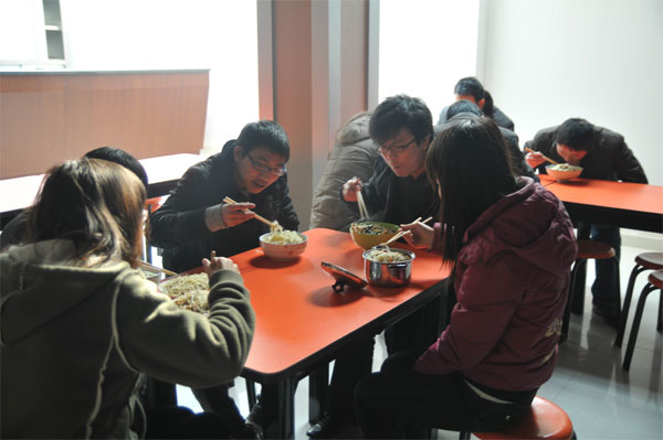 自公司搬家以來,由于多種因素,各部門員工中午吃飯都要到離公司較遠的市場就餐。隨著天氣漸冷,加之出去吃飯員工無法按時就餐,導(dǎo)致下午經(jīng)常不能按時上班,也增加了考勤管理的難度,影響了正常工作。為此,公司投入資金,按高標準、高質(zhì)量要求,購配置了大功率天然氣灶具,有大型不銹鋼蒸烤爐、立式雙門冷柜、消毒碗柜、壓面機、保鮮柜、燒水器等設(shè)備,廚房和餐廳按標準化建設(shè)要求,制定了食堂管理員職責(zé)、廚師崗位職責(zé)、衛(wèi)生要求、為了陶冶大家健康的情操,使大家在一個優(yōu)美的環(huán)境里就餐,體現(xiàn)以人為本的項目管理理念,還在員工中廣泛征集意見和飲食口味,訂立《每周食譜》,墻上還裝上設(shè)計精美的宣傳標語、美食圖。