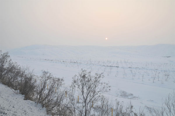戈壁,在滄海桑田中透著時代的變遷,這里曾經(jīng)盛極一時,人們前來欣賞或是憑吊遠去的盛世??墒?,眼下的蒼茫大地似乎是那么貧窮,窮得讓人心酸。站在戈壁的深處,遠望荒蕪,心中滑過一絲悲涼。但當我們再回頭看時,忽然發(fā)覺,那個真正成熟收獲的季節(jié)離我已經(jīng)越來越近了。層層積雪的覆蓋下,我們的高樓正在崛起,我們的輝煌即將鑄就。頑強的天幕人用無盡的努力在這茫茫戈壁上豎起了信念的豐碑。